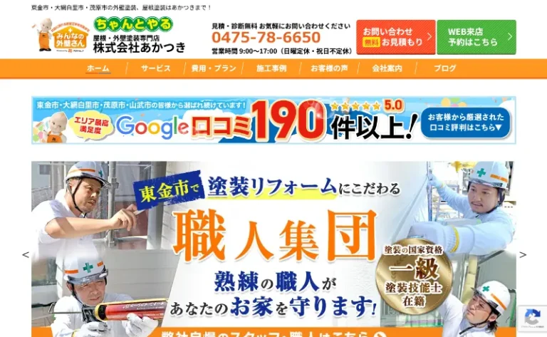 株式会社あかつきは千葉県内に複数店舗を展開する外壁塗装専門会社です。プロタイムズ東千葉店と大網店では地域に密着したサービスを提供しています。松倉代表を筆頭に経験豊富なスタッフが東金市・大網白里市・茂原市・山武市などで外壁塗装や屋根工事を手がけています。