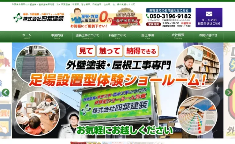 株式会社四葉建装は千葉県内で外壁塗装と屋根塗装を専門とする地域密着型の工事店です。千葉市・習志野市・四街道市・佐倉市・八街市などを中心に活動し地元のお客様のニーズに応えています。