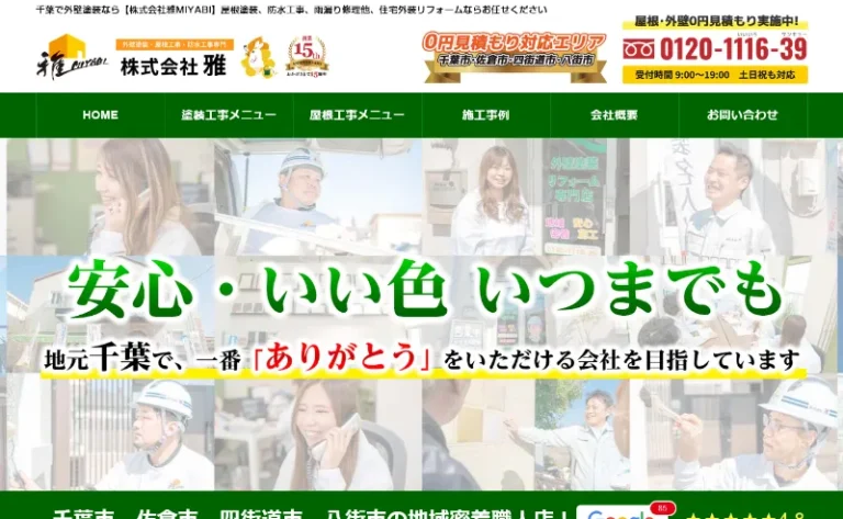 株式会社雅は千葉市・佐倉市・四街道市・八街市を中心に活動する地域密着型の外壁塗装専門店です。お客様一人ひとりの声に耳を傾け真摯な対応を心がけています。安心して任せられる塗装工事の提供をモットーにしています。