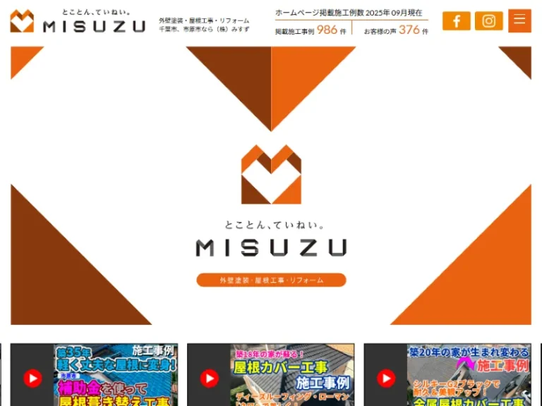株式会社みすずは千葉県千葉市を拠点とする外装リフォーム専門の塗装業者です。「屋根・外壁のことならみすずにおまかせ」をモットーに地域密着型のサービスを提供しています。累計施工実績は2,500件を超え、そのうち屋根工事だけでも1,000件以上の豊富な経験があります。