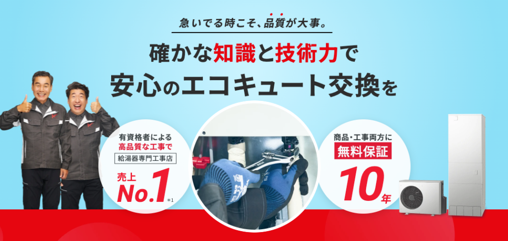 全国に実店舗を展開しているのも大きな強みで、急なトラブルが起きたときにも近くの店舗からすぐに駆けつけてもらえる体制が整っています。価格・実績・対応力のバランスに優れた、頼れるエコキュート交換業者です。