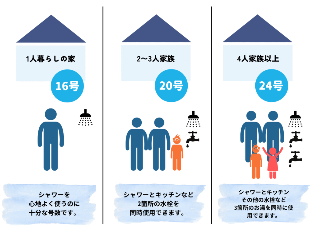 号数が大きいほど一度に出せるお湯の量が増えるため、複数の場所で同時にお湯を使っても勢いが落ちにくくなります。
