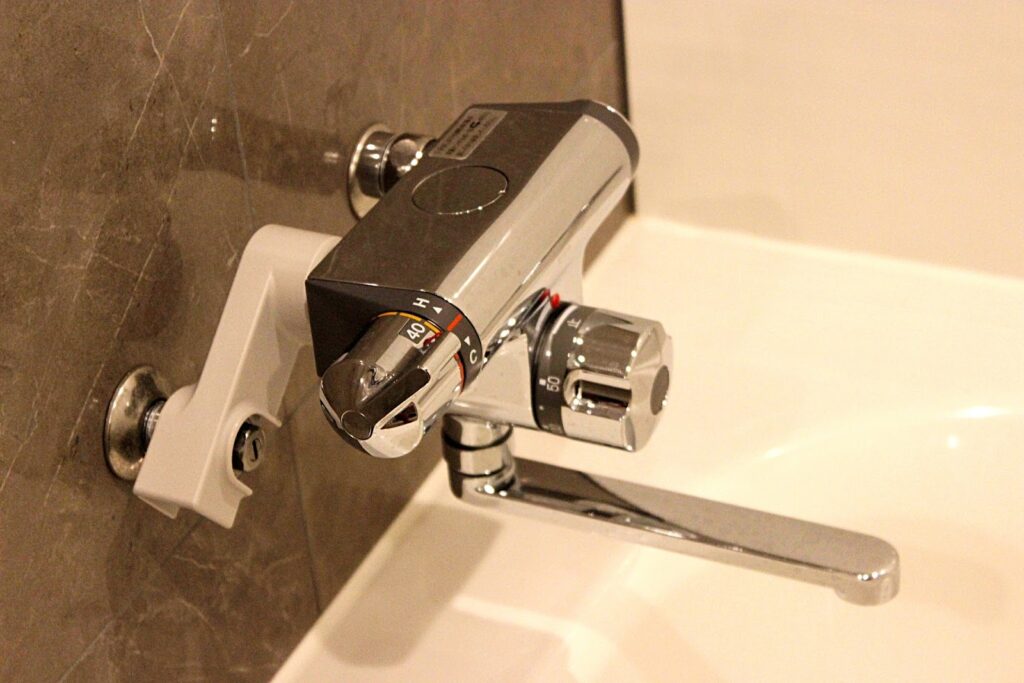 サーモスタット混合水栓とは、左側がお湯の温度、右側にシャワーと蛇口の切り替えが取り付けられているタイプのことです。お風呂場で、採用されます。