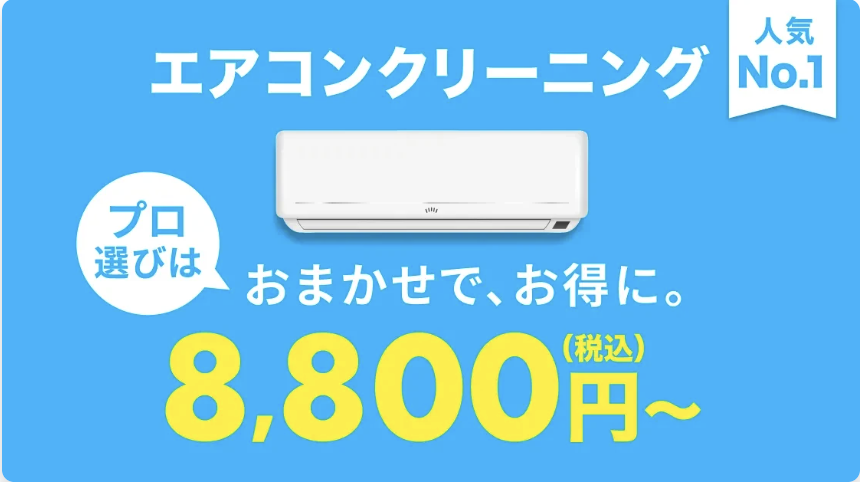 | 料金 | 壁掛けエアコン:9,980円~ お掃除機能付きエアコン:18,700円~ ビルトインエアコン(住宅用):14,300円~ 壁掛大型エアコン:14,300円~ |