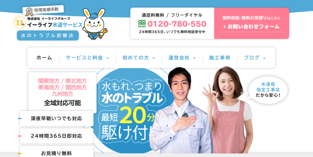 イーライフ水道サービスは、急な水漏れや詰まりなどのトラブルに迅速に対応してくれる水道修理業者です。最短20分で現場に到着する体制を整えており、「すぐ来てほしい」という緊急時の不安を軽減してくれます。