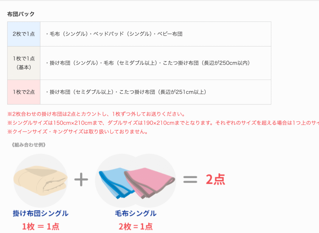 布団クリーニングのパックのサイズ目安は、以下となります。