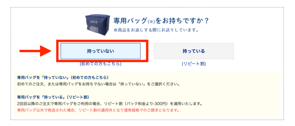 衣類クリーニングの場合は、確認画面で「専用バッグの有無」を聞かれます。初めて利用する場合は「持っていない」を選べばOK。集荷の際に段ボールを持ってきてもらえます。