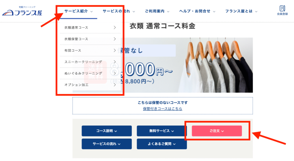 次に、ホームページの「サービス紹介」から希望するコースを選びます。